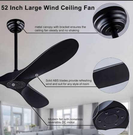 52 inch smart wood ceiling fan with remote. Reversible blades quiet DC motor timing. Light kit and remote.
