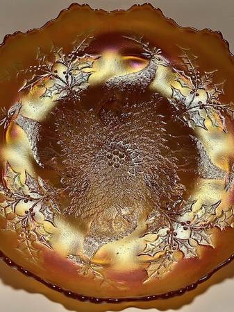 1908 to 1915 Antique Large Iridescent Fenton Stag & Holly Marigold Carnival Glass Scallop Sawtooth Edge 3 Footed Bowl 10 1/2" (W) x 4" (H) - Collector, Home Decor, Kitchen, Holiday, Party - Any...