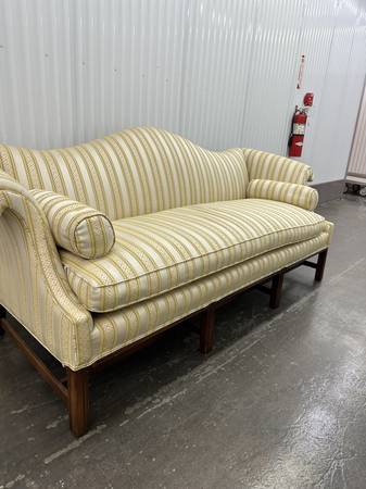 Antique Chippendale Camelback sofa late early 20th century, recently fully reupholstered in gold and white damask for sale, stored appropriately. No damage no pets.