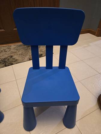 IKEA Mammut table and pair of chairs. Our boys have outgrown them. Originally $50 table and $20 chairs each. Chairs in great shape. Table still perfectly sturdy but has seen a lot of arts and crafts... just crayon covered but that's the idea. Both table and chairs can be partially disassembled.