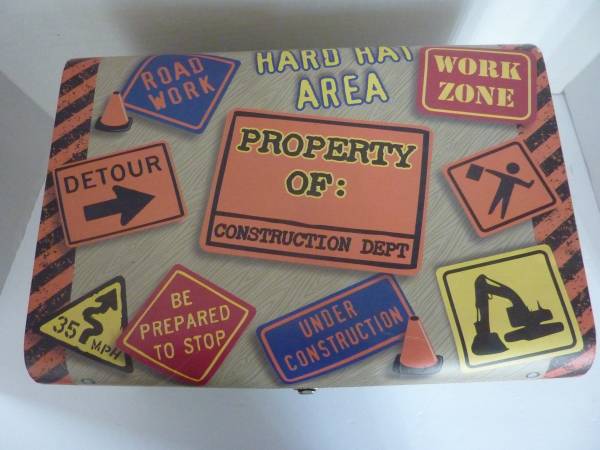 Boys trunk with toys included. The lid has a snap closure and tools design. The trunk measures 14"x10"x8". Toys include those shown in the photos and they are used. The trunk is in great condition...