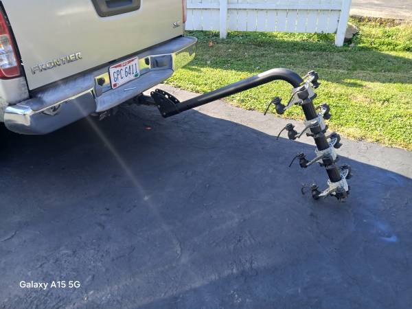 Hitch Style Bike Rack by Saris. Holds 4 Bikes. Each section is adjustable and removable if desirable. Rack can fold down for trunk access. It's ready for use but you will need to supply your own hitch pitch. It has a 2" hitch insert, and you will need to supply a hitch pin to hold it in your hitch. Excellent condition with basic wear. Cash only no holds unless on your way. I'm not available on Saturday. Call or text only