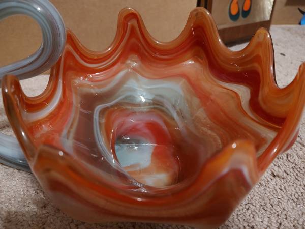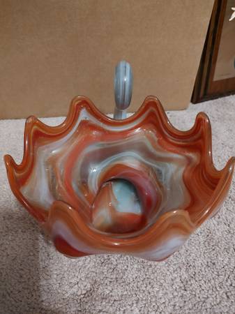 No chips or cracks. Very nice colors. Looks even better in person! Measures 11" long, 7" tall, and bowl opening is 8" wide. Asking $30. If interested, call or text show contact info