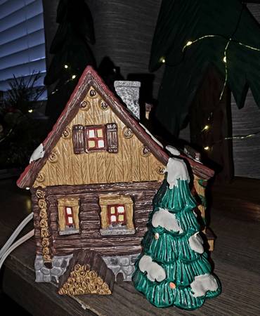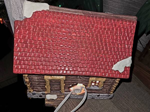 The Original Snow Village "Pinewood Log Cabin. NEVER DISPLAYED. Lighted Porcelain Building. No light cord but I have brand new single ones for $10. Came out in 1989 retired in 1995. Dept 56 number 5144-6. One of my favorites.
