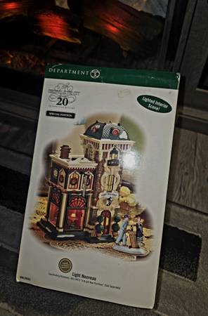 Department 56 20th Anniversary Christmas in the City Light Nouveau and it measures 9 1/4 inches tall. Lighted Porcelain Building with lighted interior scene. Comes with brand new adaptor light cord. Came out in 2006. Dept 56 number 56-59262