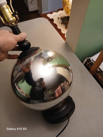 Vintage Tyndale glass lamp. Some discoloration inside. Works. Good used condition with light wear and discoloration. Not sure if interior is chromed or mirrored. Measures 10"w x 25"h to finial. Cash only no holds unless on your way. I'm not available on Saturday.