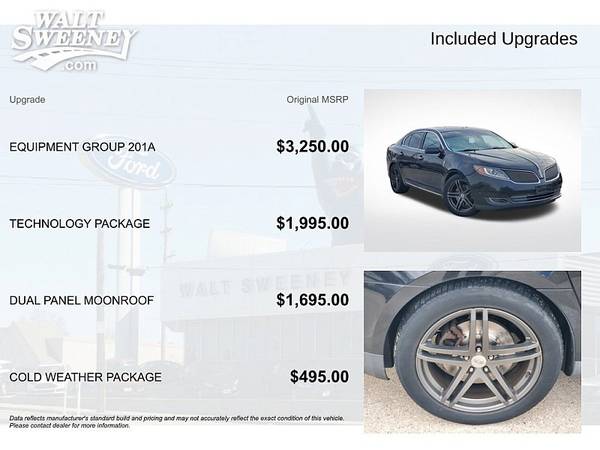 2014 LINCOLN MKS ECOBOOST! NEW TIRES AND UNDER $10,000!Experience the Epitome of Luxury and Performance with this Stunning 2014 Lincoln MKS EcoBoostThis 2014 Lincoln MKS EcoBoost is a true standout in the luxury sedan market, offering an unparalleled blend of sophistication, power, and cutting-edge technology. With its sleek black exterior and meticulously crafted interior, this vehicle is sure to turn heads wherever you go.¢ SUPER LOW MILES¢ PRICE DROP¢ PRICED BELOW KBB FAIR RETAIL¢ CHEAP PAYMENTS¢ LEATHER¢ BLUETOOTH¢ BACKUP CAMERA¢ HEATED SEATS¢ COOLED SEATS¢ PROFESSIONALLY CLEANED¢ MILES UNDER MARKET AVERAGE¢ TWIN PANEL MOONROOF¢ HEATED STEERING WHEEL¢ REMOTE START¢ ADAPTIVE CRUISE CONTROL¢ NAVIGATION SYSTEM¢ BLIND SPOT WARNINGPowered by a robust 3.5L V6 EcoBoost engine and equipped with all-wheel drive, this Lincoln MKS delivers an exhilarating driving experience without sacrificing fuel efficiency. With an EPA-estimated 25 MPG on the highway, you can enjoy the thrill of the open road without constantly visiting the gas pump.New Tires InstalledBeyond its impressive performance, this Lincoln MKS is packed with a wealth of premium features that cater to your every need. From the luxurious leather-trimmed seats with heating and cooling capabilities to the advanced navigation system and state-of-the-art THX II audio system, every detail has been meticulously crafted to provide you with a truly exceptional driving experience.The Lincoln MKS also boasts a suite of cutting-edge safety and driver-assist technologies, including Collision Mitigation with Adaptive Cruise Control, Active Park Assist, and the Blind Spot Information System (BLIS). These features not only enhance your driving confidence but also provide an unparalleled level of protection for you and your passengers.With its spacious and well-appointed interior, the Lincoln MKS offers ample room for both passengers and cargo, making it the perfect choice for those who demand both luxury and practicality. Whether you're commuting to the office, embarking on a road trip, or simply enjoying a leisurely drive, this vehicle will exceed your every expectation.Why buy from Walt **Exclusive Complimentary 200,000 mile warranty, see dealer for details!!**