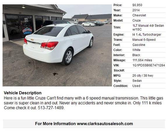 Here is a fun little Cruze Can’t find many with a 6 speed manual transmission. This little gas saver is super clean in and out. Never any accidents and never smoke in. Only 111 k miles Come check it...