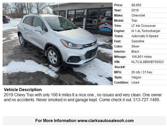 2019 Chevy Trax with only 106 k miles It a nice one , no issues and very clean. One owner and no accidents. Never smoked in and garage kept. Come check it out. .