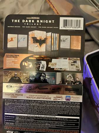All three films 4K and Blu-ray, plus bonus materials (screen cards, script notes, etc)