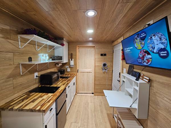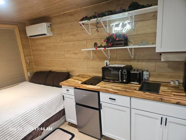 20-foot shipping container cabin that can be repurposed as an Airbnb, office, or home. It is manufactured in the United States and offers a versatile and portable living or working space. Fully furnished