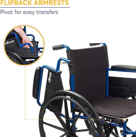 Drive Blue Streak Wheelchair with Flip Back Desk Arms, Swing Away Footrests,Folding, Desk Length Arms, Alloy Steel, 20 Inch Seat, purchased but didn't use, sells for $159, Amazon's Choice, asking $70