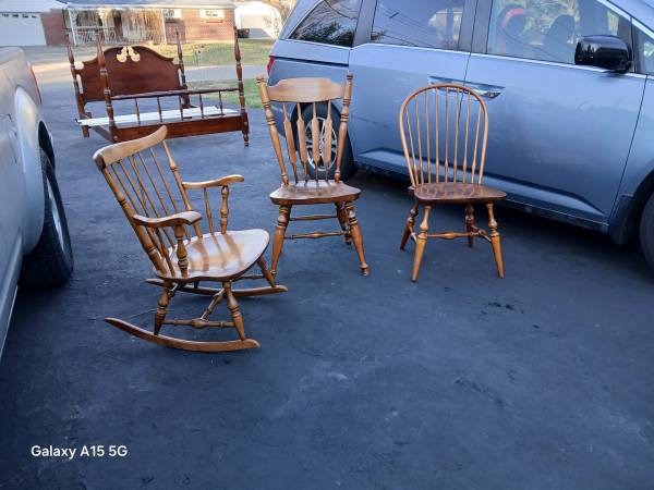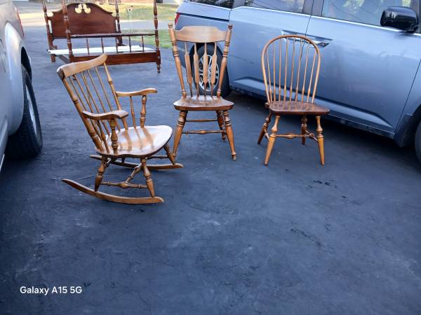 Vintage Early American Colonial style chairs. All in good condition. Nichols and Stone rocker is $30. middle chair by Virginia House Furniture, chair on right is Ethan Allen. Cash only no holds unless on your way. I'm not available on Saturday. Call or text only