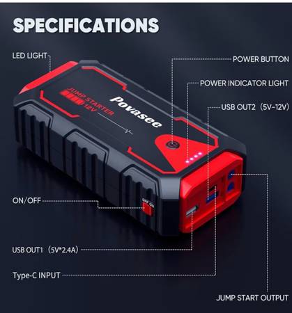 NEW Portable Jump Starter, Flashlight, and charger with cables and case! Brand new in sealed box