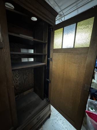 Solid oak armoire with decorative glass panels. 7’5” tall x 4’5” wide, 2'1" deep Features modern sliding doors, interior shelves, hanging rod, and bottom drawers. Modified to fit to serve as a TV console or can be used for clothing. Good vintage condition.