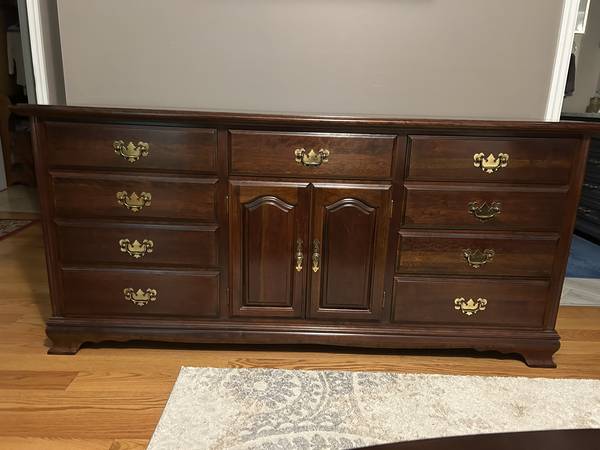 Original owner -purchased in 1992- this heirloom cherry queen bed is in excellent condition. Includes headboard, frames/slats and end board. The dresser (w/mirror), High Boy (chest) and (2) nightstands are available for $1600 extra ($2500 total).