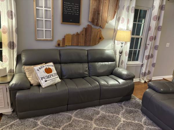 3 piece leather furniture set. Power recliners. Power headrest. USB ports in each. Clean home. Great shape, normal wear. (There is a scratch shown on one section of long couch) $1200 obo.