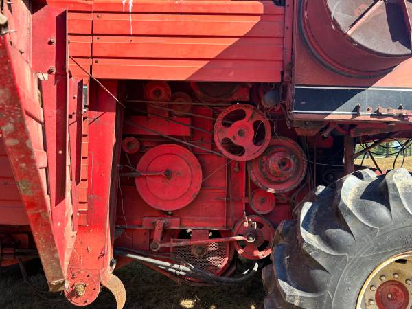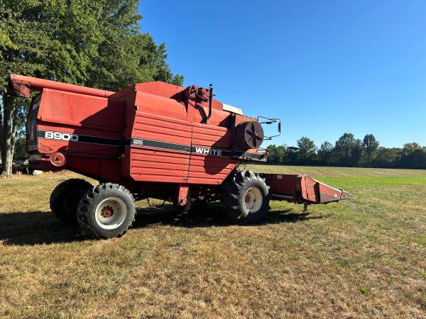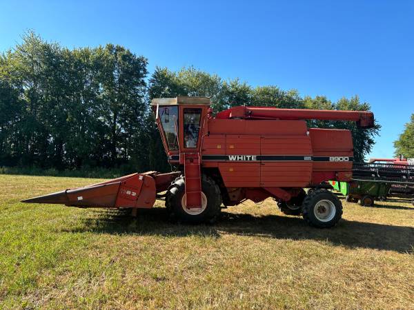 White 8900 farm boss combine harvester for sale has mud hog unit has a Perkins turbo diesel motor shows 4871 hrs was told it was rebuilt around 2500 hrs but I have no paper work for that . I put a new starter on last fall , runs good . Replaced a few belts over the last 2 years I have several extra parts for this machine from another combine that was scraped. See pictures . second gear is out I harvest in first gear and third for road travel . It been like this for 2 years . I have another transmission with all the extra parts ,I have extra tires and rims to go with it to , also going with this is a massy 1163 6 row 30 inch corn head and a John Deere 220 grain table -bean header - new wood slats put on last spring .. all is decent shape , selling due to up grading $4000.00 call 513 two five six seven two five five cash only at pick up!