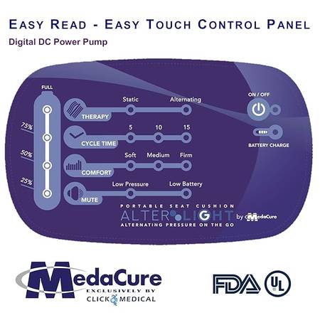 TOUCH SCREEN PUMP CONTROL: The included pump comes with straps to hang it on the back of a wheelchair. It has an easy to read digital controls, With adjustable therapy controls: 5, 10 and 15 mins cycle times; alternating or static; and high low and medium pressure. It also low pressure and low battery indicators.