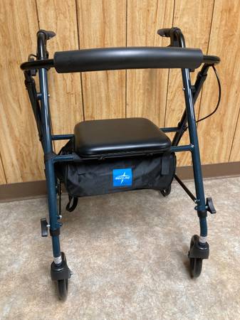 opened box to assemble and make sure all parts are in good condition smokey blue/dark green color 6" wheels - 250 lb. capacity 17" between handles aluminum frame