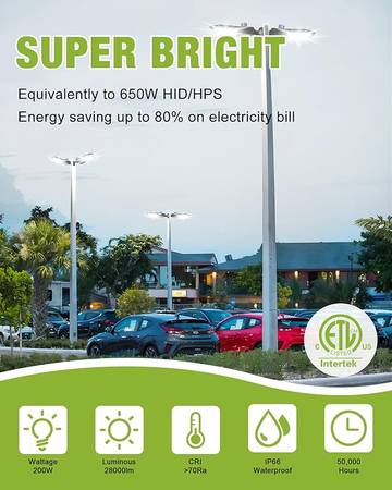 Ultra high brightness - The led parking lot light offers an impressive 42,000lm brightness and 5000K daylight color temperature, effectively enhancing visibility in parking lots and ensuring the safety of drivers and pedestrians.It significantly reduces energy consumption compared to traditional lighting fixtures.