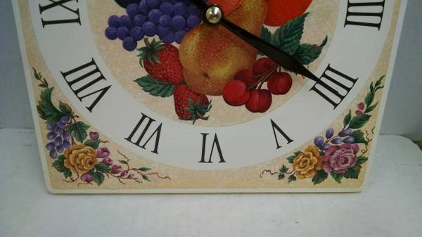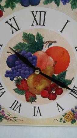 Excellent condition, a 10.5" x 8" wall clock showing flowers and fruits. Uses an AA battery and comes with a new one installed. Cclean and ready to hang. To see all my clocks, put GOODTIMES in the craigslist searchbox, or click "more ads by this user."