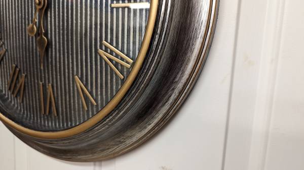 Excellent condition, an 18" metal look wall clock, silver and gold. Glass face cover, uses an AA battery, and comes with a new one installed. Clean and ready to use.To see all my clocks, put...