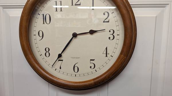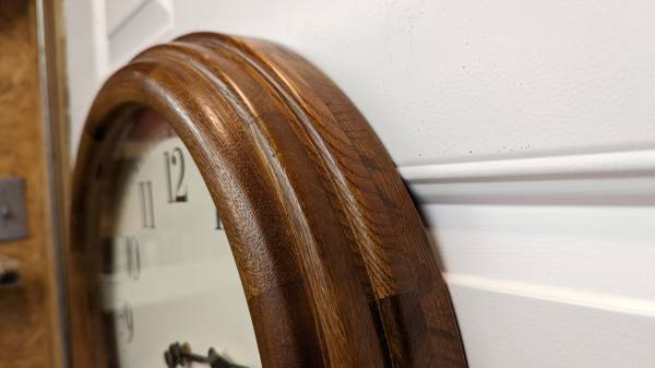 Excellent condition, a 15.5" diameter solid wood wall clock, clean and ready to use. Glass face cover, uses an AA battery, and comes with a new one installed. To see all my clocks, put GOODTIMES in...