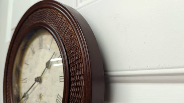 Excellent condition, a Sterling and Noble11.5" wood framed wall clock. Domed glass face cover, used an AA battery, and comes with a new one installed. Clean and ready to hang.