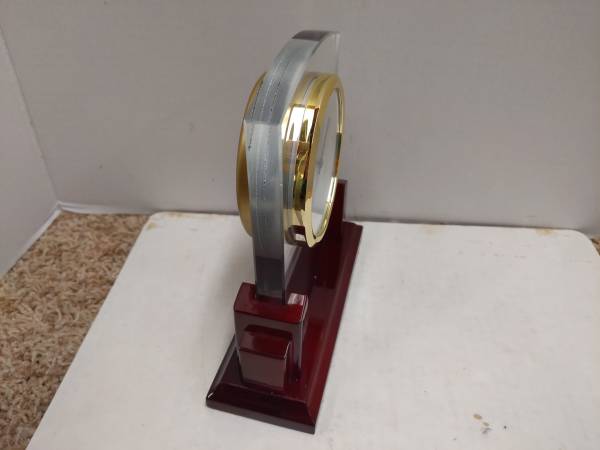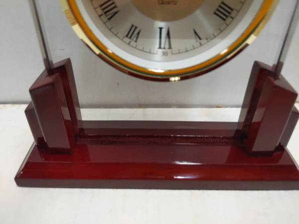 Excellent condition, I think it is new. A small desk clock, glass and rosewood. About 7" high, 6.5" wide, and 2.5" deep. Uses an AA battery and comes with a new one installed. Clean and ready to use. To see all my clocks, put GOODTIMES in the craigslist search box.