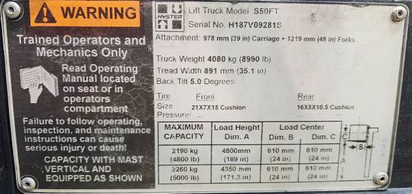 We have a nice 2018 Hyster cushion tire forklift, model S50FT, 5000 lb capacity, LP gas (tank not included), 4 cyl engine, 84"/189" 3 stage mast, load backrest, sideshift, 42" forks, 4 function cow mounted lever controls (note 4th lever is plumbed to the mast), directional lever function, nice seat, front headlights, rear beacon light, good non-marking tires. Forklift has 8442 key hours. This is a retired rental unit that has been well maintained. It runs great and is ready to go to work! Price - only $8,750.00. Includes 30-day drive line warranty (internally lubricated parts). Delivery available. five.one.three.616246O. 20 minutes west of downtown Cincinnati.