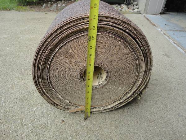 Heavy duty paper sanding roll. Rolls are used for dry sanding in wood, stone, plastic, fiberglass and concrete applications. Cut into strips for manual sanding tools or attached to a vibrating sander. Use strips for sanding on wood flooring, natural stone, plastic, fiberglass and concrete. This is a very aggressive paper and quickly levels uneven surfaces. I asked at a tool rental facility and was told it was used for a drum sander when building new homes to level uneven newly built floors before the final surface is added. I don’t know how long this roll is but it is about 15 inches in diameter by 12 inches wide. I would guess it to be about 50 feet in length.