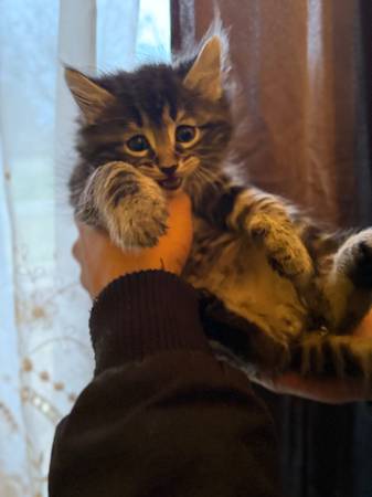 last of his litter. 8 week old long haired tabby kitten. can come with bag of food and litter/litter box if needed. asking $30 rehoming fee to ensure good home.