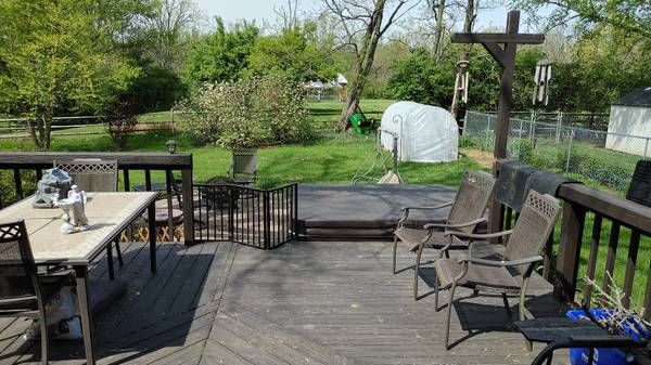 Large yard with deck, fire pit, patio, and Hot Springs Jacuzzi