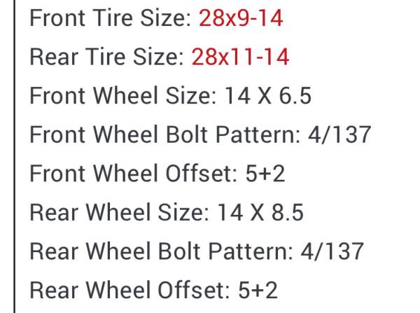 I have a set of wheels and tires off a 23 Commander XT 1000. Trail King tires. They are new take offs. No trades.
