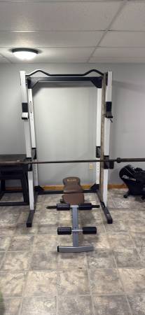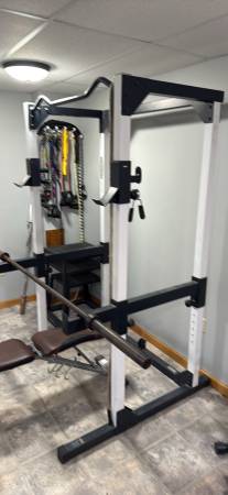 The GRT 400 is a power rack system, which includes a pull up bar, plate loaded high and low pulley along with bench, squat. The Pull up bar is shaped to allow you to work several different muscle groups, triceps, biceps, chest and shoulders. The plate loaded pulley system allows you to work, lats, bi's, tri's, chest, shoulders. The pulleys allow you to feel only the weight like you're supposed too. The cage station is solid. The rests are adjustable up and down the four main posts of the system. The cross members allow you to spot yourself and can handle a tremendous lateral load. The squats are done completely enclosed inside the cage to ensure your safety. This system is solid top to bottom. Over 200 lbs of free weights & bench included along with interlocking rubber mats! Cage Unit measurements are Length = 4 feet, Height = 7 feet 4 inches, Width = 3 feet 6 inches Cashapp, Venmo, PayPal also accepted!