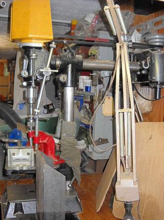 This Press comes with, 2-Hold Down Clamps, Speed ajust Drill Press Vice, AUTO TAPPINGHEAD a Large and one Medium size setup angles. Press sets on a bench with wheels, A drawer and compartment below for storage and a work light. PICK UP LOADING IS UP TO THE BUYER AND PAYMENT IN CASH AT TIME OF LOADING, [NO CHECKS]. Come to 3700 Feldkamp Ave. last house on the left. show contact info
