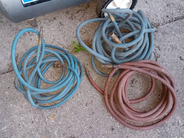 Campbell Hausfeld air compressor. Works perfectly except power switch sticks in on position. Have to unplug to turn it off. Has excellent pressure. Can test it out. 100' of hose included